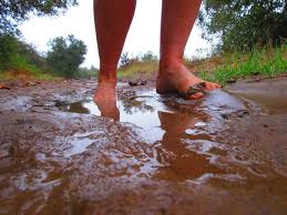 barefoot through a mud puddle, feeling the squish of cool-warm ooze between bare toes,